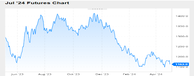 Nivel de futuros en CBOT últimos quince días: más alto 11.89, el bajo 11.47, cerrando
