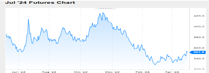 Nivel de futuros en CBOT últimos quince días: más alto 360.6, el bajo 336.8, cerrando