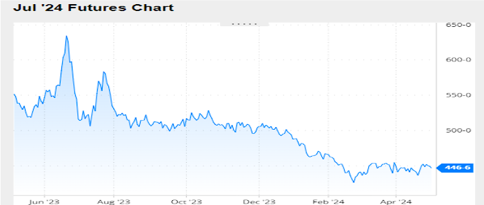 Nivel de futuros en CBOT últimos quince días: más alto 4.53, el bajo 4.36, cerrando a