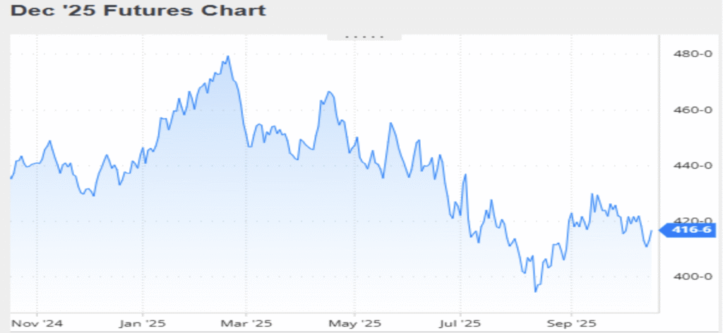Nivel de futuros en CBOT últimos quince días: más alto 4.23, el bajo 4.10, cerrando