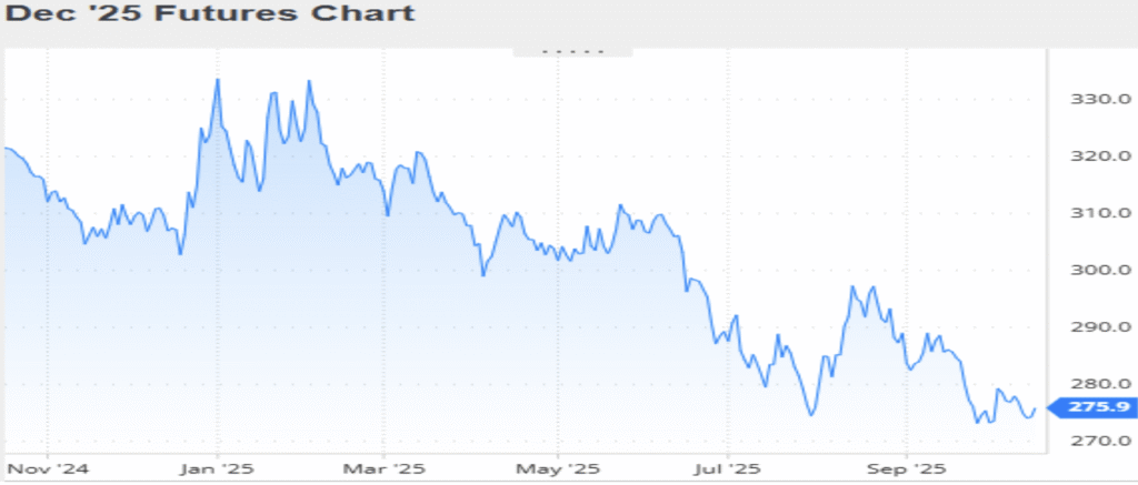 Nivel de futuros en CBOT últimos quince días: más alto 281.1, el bajo 272.9,