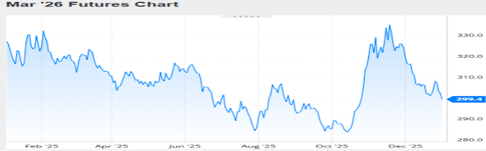 Nivel de futuros en CBOT últimos quince días: más alto 310.1, el bajo 299.0, cerrando a 299.4.